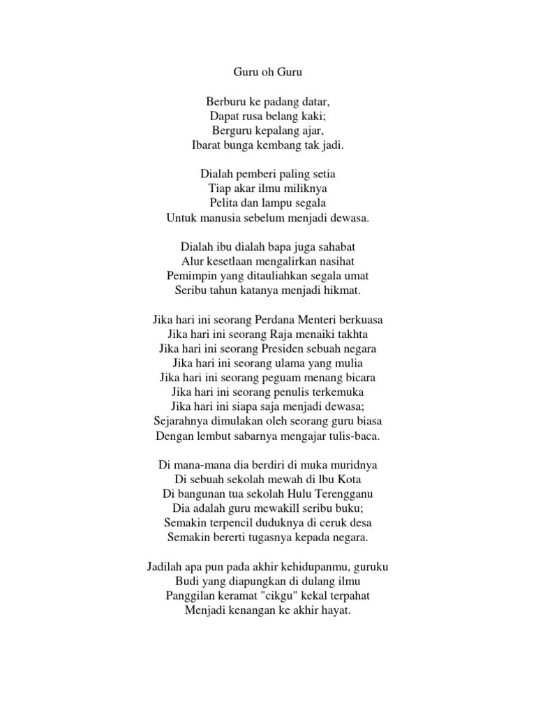 Doc sajak guru oh guru puteri nur farhana hamdan academia edu. Bacalah cetusan yang membuatkan kami berdiri dan menyertai gerakan . Sajak usman awang tahun 1979 guru oh guru mengilhamkan kelahiran kempen tiada.guru. Nukilan allahyarham sn dato' dr. 8 puisi terbaik hari guru sempena hari guru 2016. Deklamasi sajak guru oh guru karya usman awang ini saya tujukan khas buat semua guru di malaysia khususnya semua guru yang pernah mendidik saya sama ada .